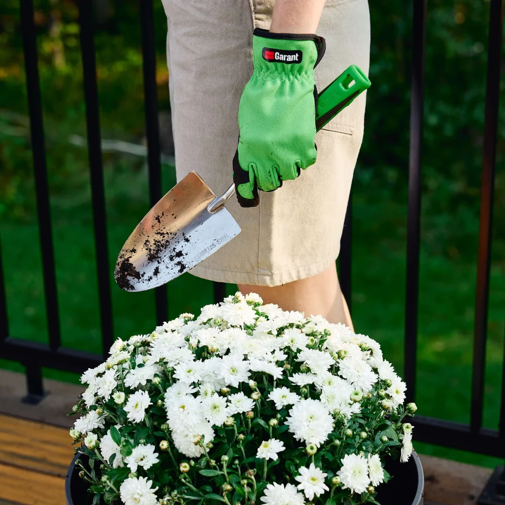 The Garant Hand Trowel features a corrosion-resistant stainless steel blade and a gel-padded non-slip grip for comfortable digging and transplanting, plus a hanging hole and compatibility with the Garant Interchangeable Tool Handle (85698).