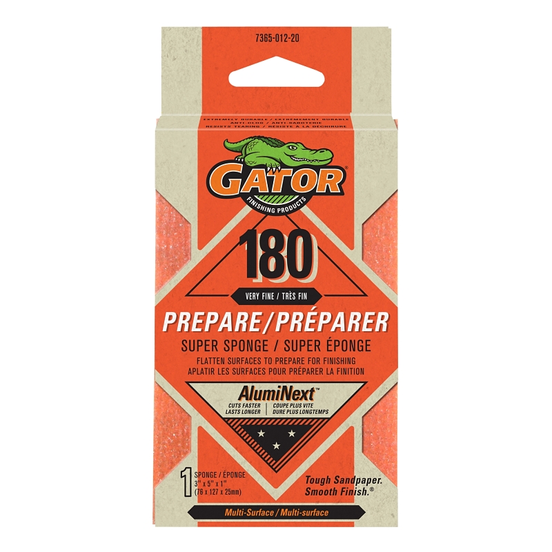 Gator 736501220 Sanding Sponge, 5 in L, 3 in W, 180 Grit, Aluminum Oxide Abrasive