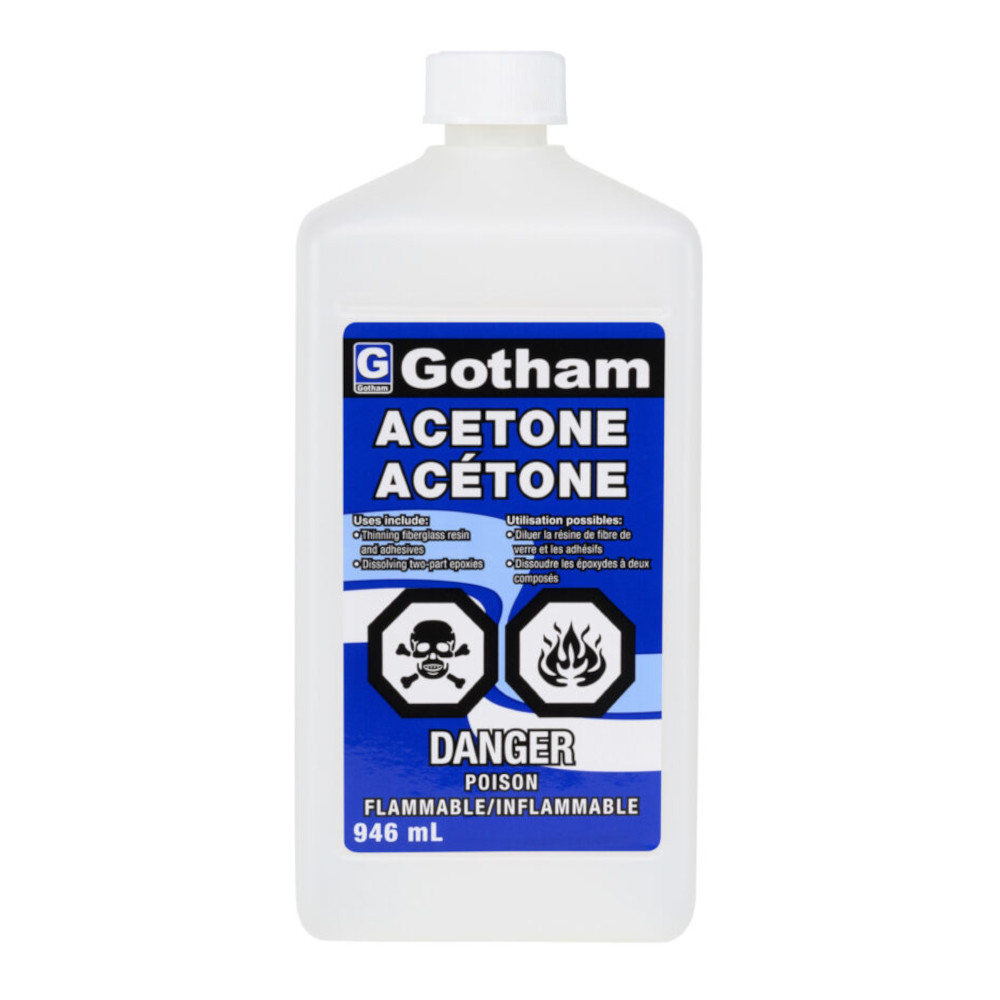 Acetone is the fastest evaporating solvent available for thinning and cleaning fiberglass resins and epoxies. It is a strong solvent for most plastics and synthetic fibers. It also removes the sticky residue left on glass and porcelain by price stickers and other adhesive labels.