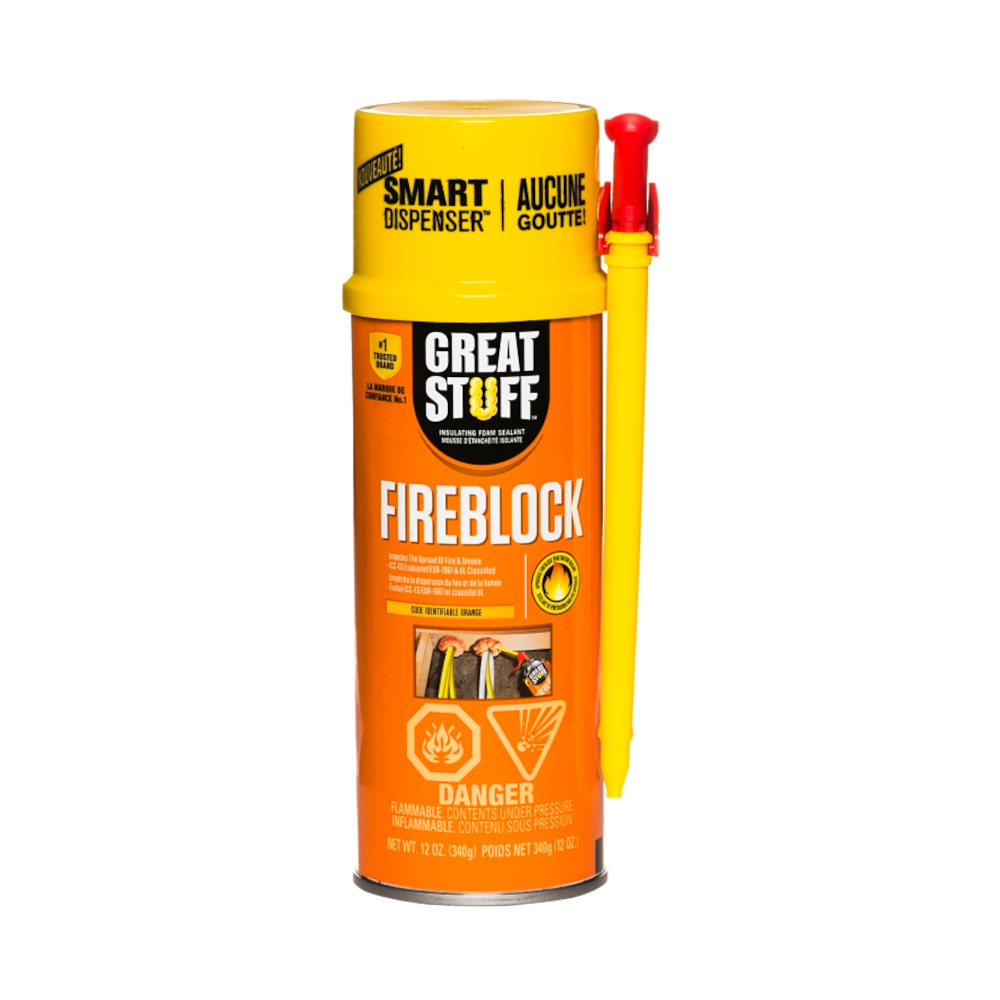 Designed to help save much more than energy costs, Great Stuffâ„¢ Fireblock insulating foam sealant insulates and seals service penetrations, providing an airtight barrier that impedes the spread of smoke and flames. Great Stuffâ„¢ Fireblock insulating foam sealant is a ready-to-use, minimal-expansion insulating foam sealant that fills and insulates gaps up to 3/4 in to restrict airflow. This distinctly orange solution seals electrical wiring run through wall studs as well as service penetrations in walls and between floors to provide a simple, cost-effective way to maintain the continuity of an approved fire block material throughout the house.