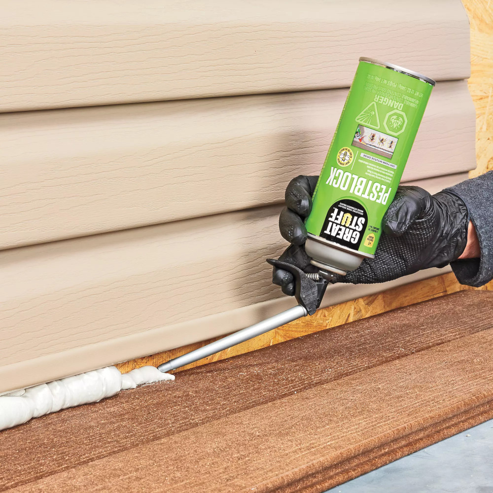 Effective and easy to use, Great Stuffâ„¢ Pestblock insulating foam sealant blocks insects and pests from entering the home by sealing gaps, cracks and holes while improving energy efficiency all around the home. Great Stuffâ„¢ Pestblock insulating foam sealant is a ready-to-use foam sealant that expands up to 1 in to take the shape of gaps, creating a long-lasting, airtight and water-resistant seal that blocks out spiders, ants, cockroaches, mice and more from entering the home without the use of pesticides.