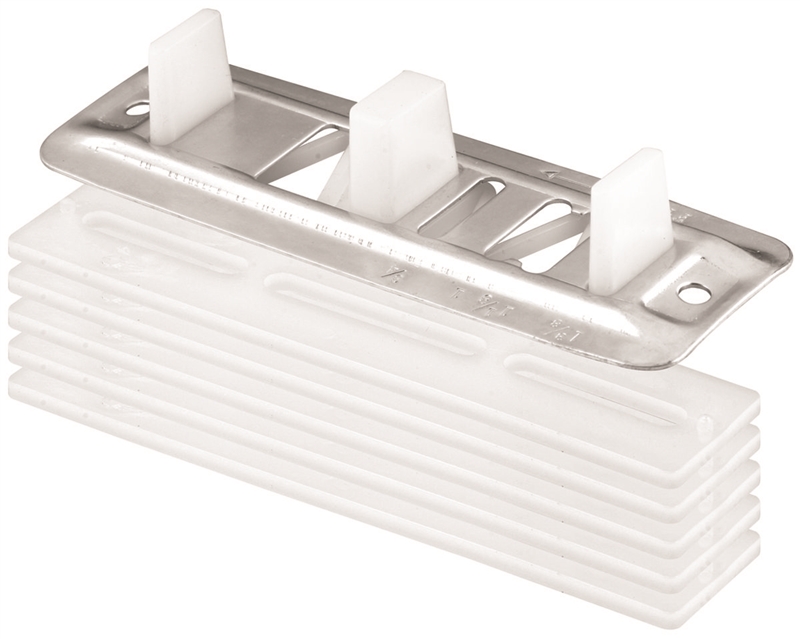 N 6661 is a bi-pass floor guide that can be used universally on most wardrobe doors systems. The nylon guides are adjustable to accommodate 3/4 to 1-3/8 in closet doors. The carpet riser shim plates can raise the guides from 1/8 to 5/8 in above the floor to accommodate the height of the carpet.
