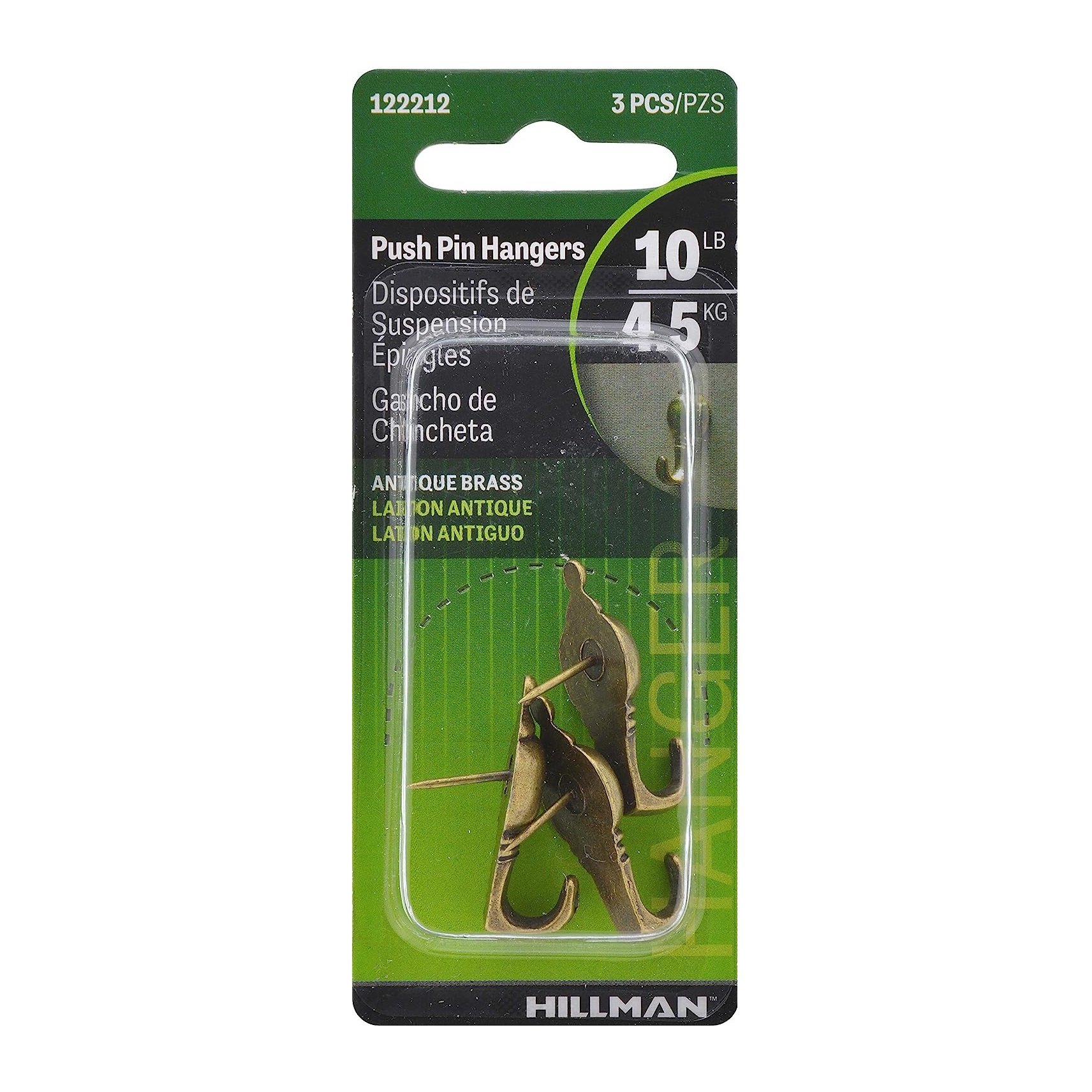 Hillman Push Pin Hanger, Antique Brass, 3 Pack 122212