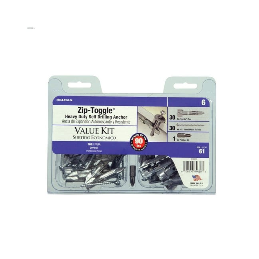 #6 Zip toggle anchor is specifically designed for use with various hollow wall depths and applications. It supports up to 90 lb of weight capacity and comes with screw.