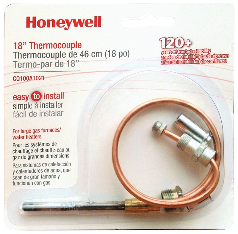 Our 18 in replacement thermocouple can help, which includes an adapter for easy mounting on most pilot burners. 18 in Replacement thermocouple for 30 mV systems. The Honeywell 18 in replacement thermocouple is designed for 30 mV systems (gas furnaces, boilers and water heaters) where you require that length. The thermocouple comes with an adapter for easy mounting on most pilot burners, including push-in, clamp-in and screw-in burners.