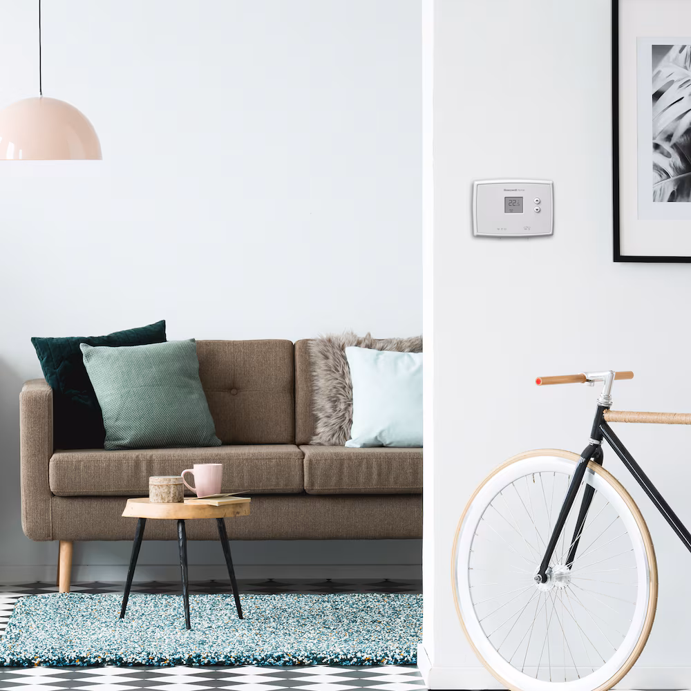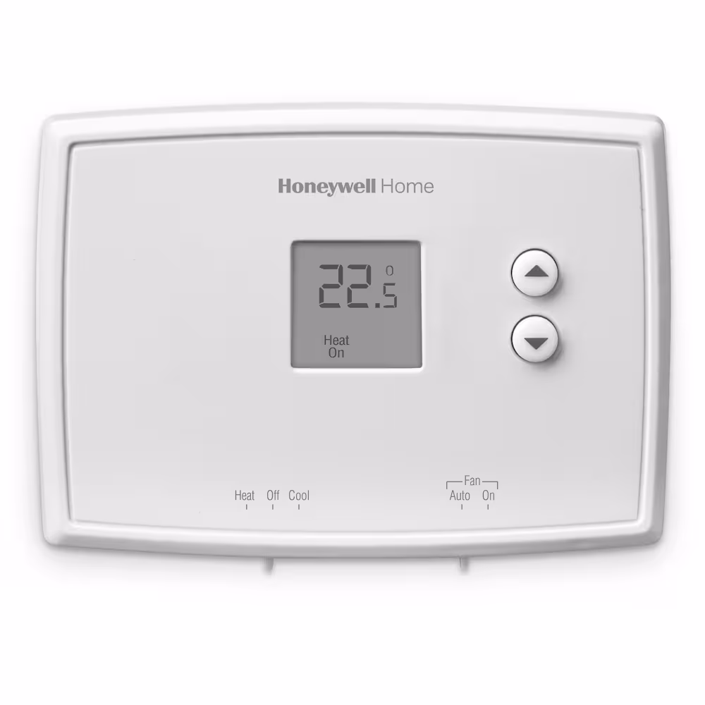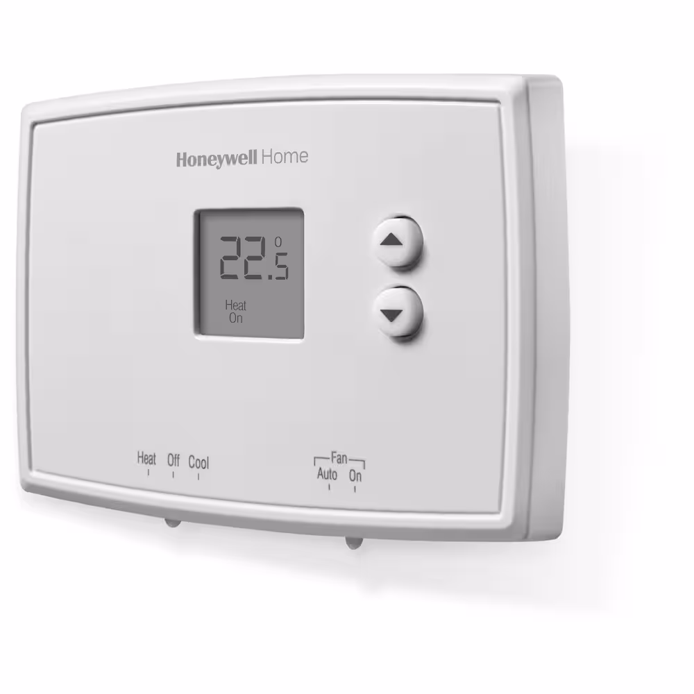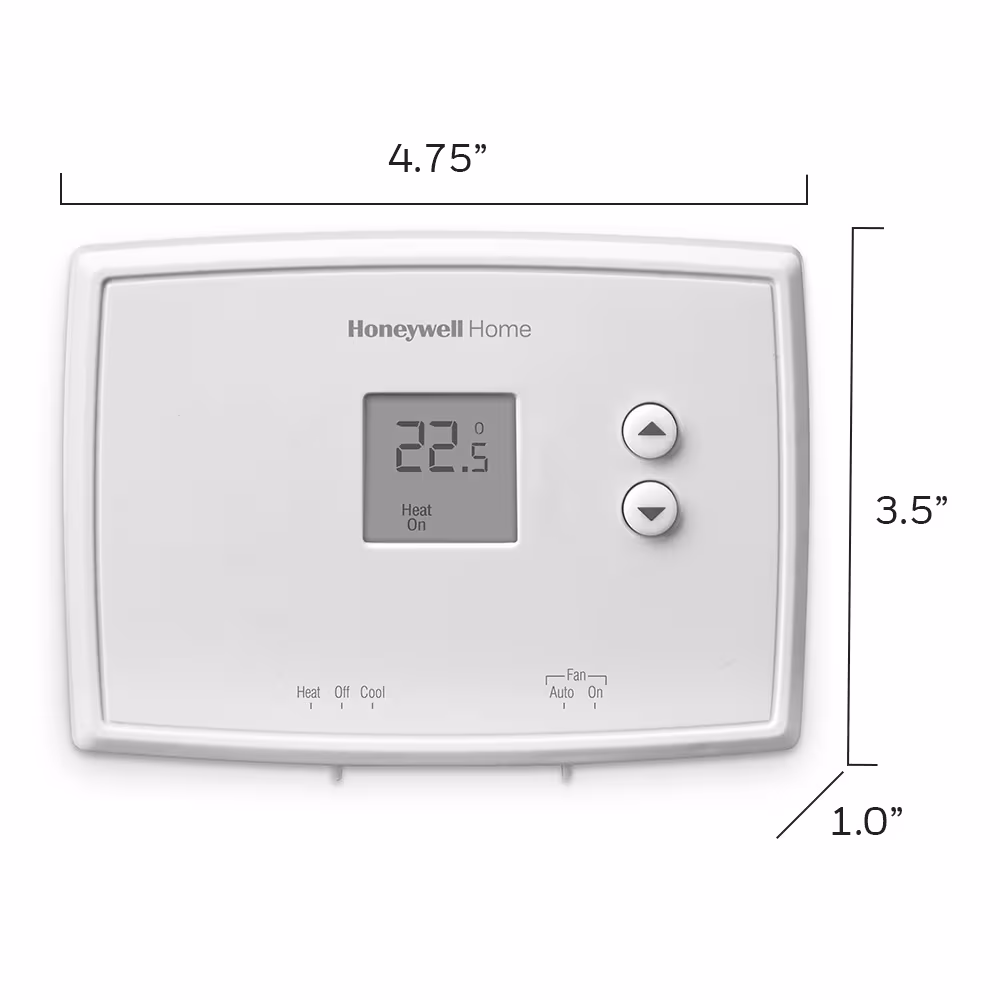 The Honeywell Home Digital Non-Programmable Thermostat offers electronic controls and a large digital display for simple control of your heating and cooling system. It has precise temperature control of +/- 1 degree Fahrenheit. It is easy to use, easy to see and has an easy-access battery compartment.