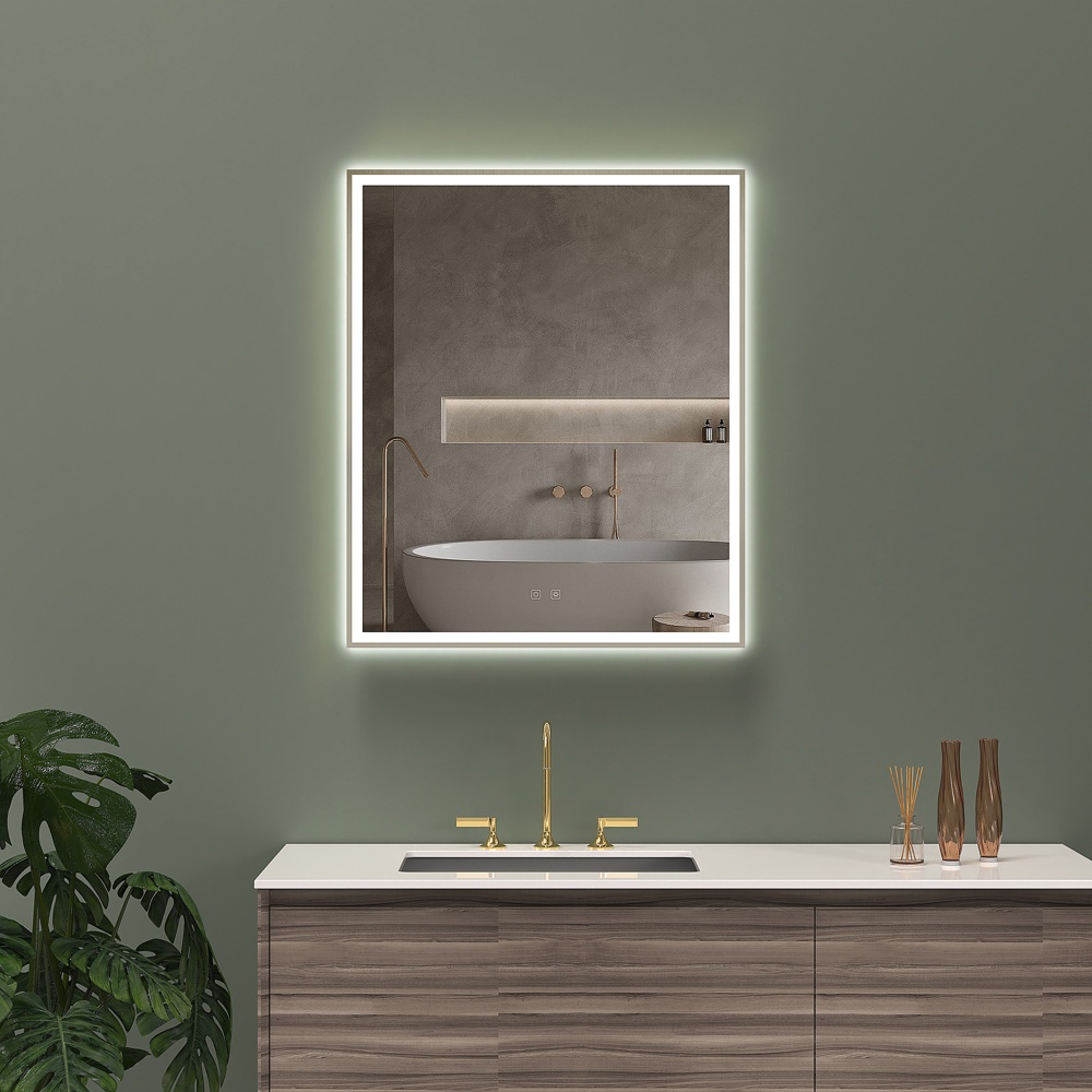Features include adjustable color temperature ranging from 2700K to 6500K, dimmable brightness between 10% and 100%, and memory settings that retain your preferred lighting configurations. The integrated heated defogger ensures a clear reflection, while touch-sensitive controls offer intuitive operation. The mirror is constructed with copper-free glass and a safety film backing for enhanced durability and safety.