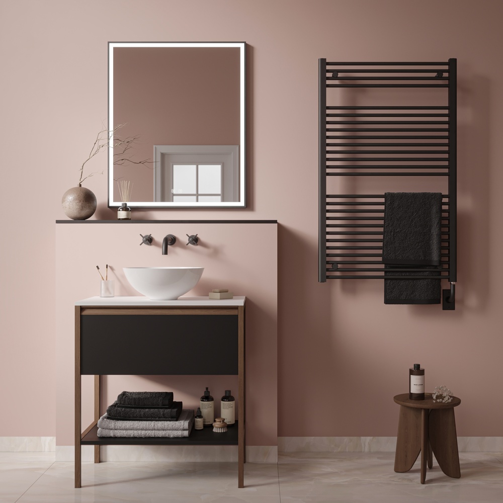 The Eden LED Mirror offers a contemporary design with both front and back acrylic diffused LED lighting, providing balanced illumination suitable for various settings. Its anodized aluminum frame is available in matte black, brushed gold, or brushed bronze finishes, complementing a range of interior styles.