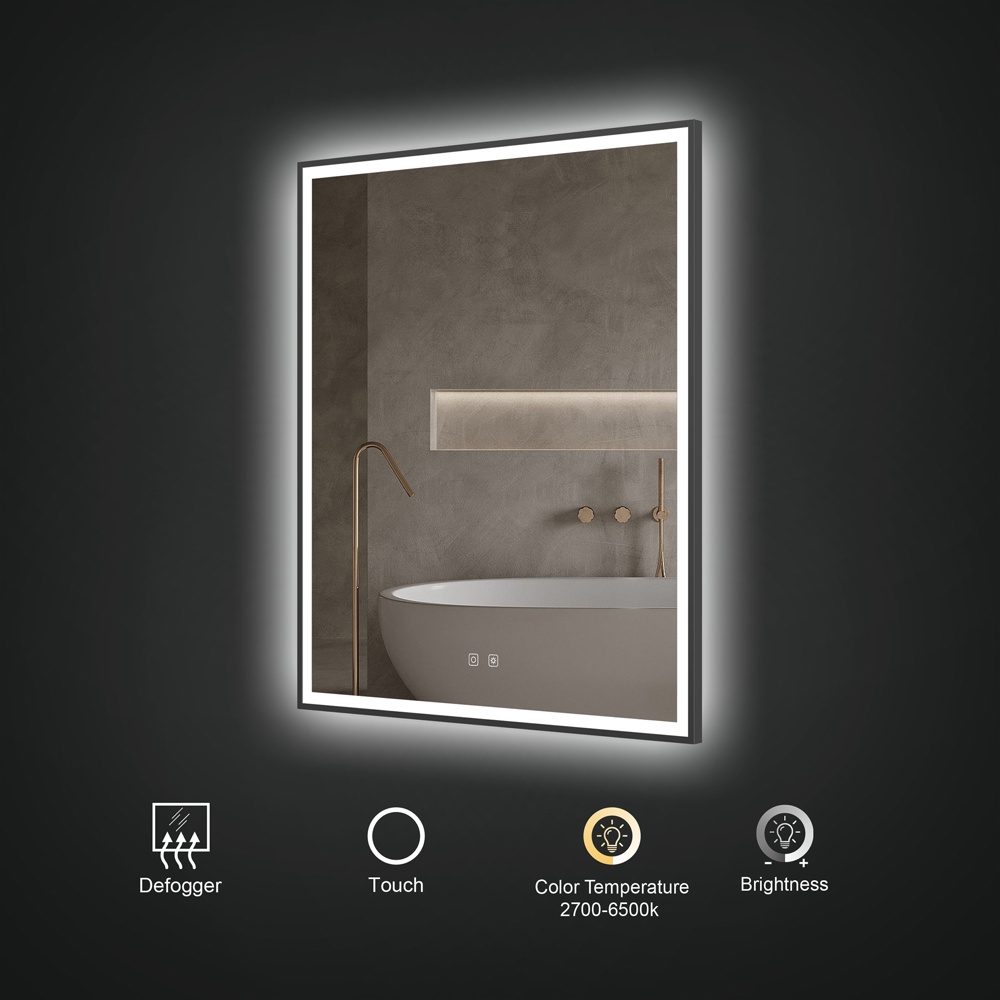Features include adjustable color temperature ranging from 2700K to 6500K, dimmable brightness between 10% and 100%, and memory settings that retain your preferred lighting configurations. The integrated heated defogger ensures a clear reflection, while touch-sensitive controls offer intuitive operation. The mirror is constructed with copper-free glass and a safety film backing for enhanced durability and safety.