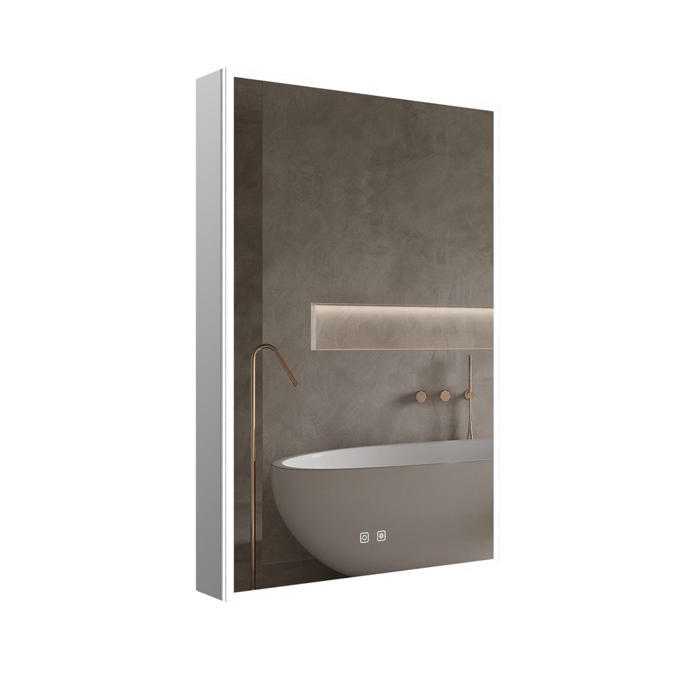 Key features include adjustable color temperature ranging from 2700K to 6500K, dimmable brightness between 10% and 100%, and memory settings that retain your preferred lighting configurations. The integrated heated defogger ensures a clear reflection, while touch-sensitive controls offer intuitive operation. Constructed with copper-free glass and a safety film backing, the cabinet ensures durability and safety in bathroom environments.