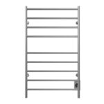 The Kontour Linear 24″ x 40″ Electric Towel Warmer features a sleek, wall-mounted design with nine evenly spaced round bars, providing ample space for warming multiple towels simultaneously.