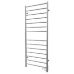The Kontour Linear 24″ x 60″ Electric Towel Warmer features a sleek, wall-mounted design with 12 evenly spaced round bars, providing ample space for warming multiple towels simultaneously.