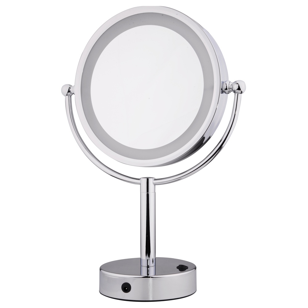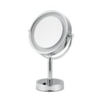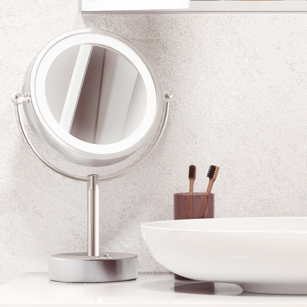 Elevate your daily routine with the Volkano 8.5″ Double Sided Lighted Freestanding Mirror from ICO Bath. Designed for both functionality and elegance, this mirror features a dual-sided design with 1x magnification on one side and 5x on the other, perfect for detailed grooming tasks like makeup application and skincare. The 360° swivel allows for effortless angle adjustments, ensuring optimal viewing. Its integrated LED lighting provides warm illumination, enhancing visibility in any setting. Crafted from durable brass and available in finishes like Chrome, Brushed Nickel, and Matte Black, this freestanding mirror seamlessly complements any bathroom décor.