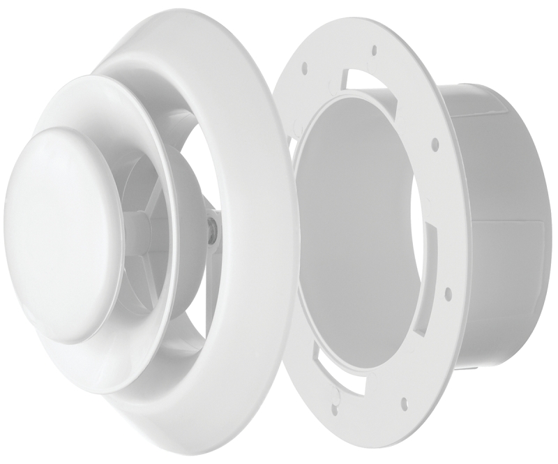 Overlapping rings stepped down for efficient, draft-free diffusion. Outer ring design resists ceiling smudging. Made of white polypropylene and supplied with an adaptor. Two flow settings for easy control of air intake or output from 0 to 100% for outstanding efficiency. Can be connected to a flexible or rigid duct.