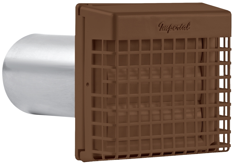 Imperial Louvered Vent Hood with Guard, 4 in Dia Duct, 4 in Duct Length, Plastic Hood, Brown Hood, 7.1 in Hood Width, Hood Height: 7.1 in, Hood Depth: 2.6 in, 4 in Dia x 10.2 in H Overall