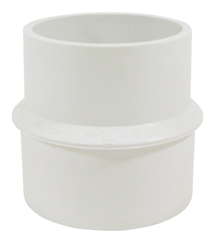 An extended bushing is used to connect two different sizes of sewer pipe at a PVC sewer fitting. The hub end accepts the smaller size PVC pipe.