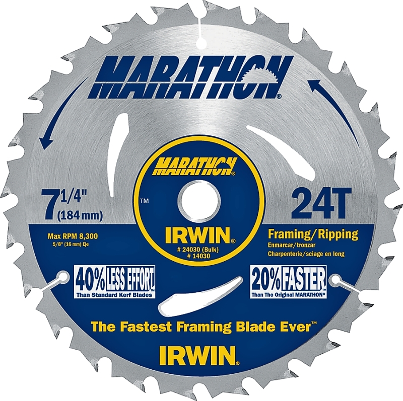 IRWIN MARATHON 24030 Circular Saw Blade, 7-1/4 in Dia, 5/8 in Arbor, 24-Teeth, Carbide Cutting Edge