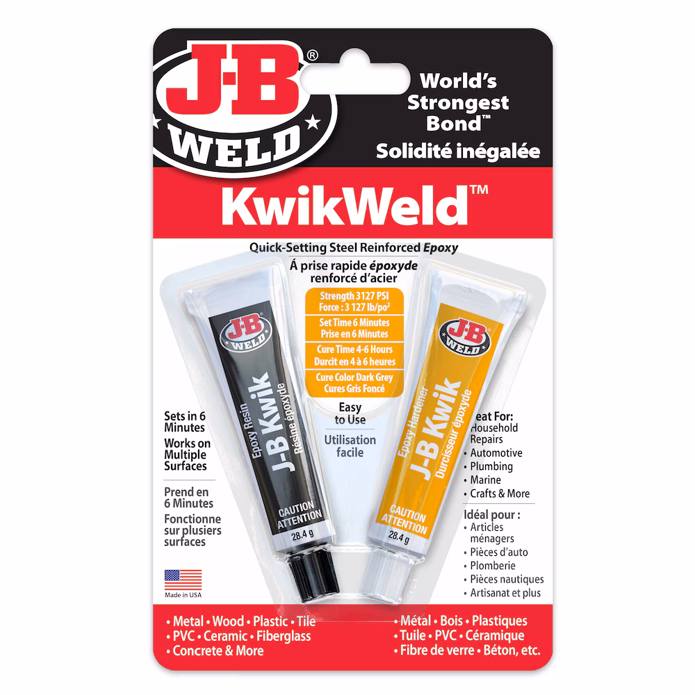 J-B Kwik Weld is a fast set – cure version of J-B Weld that will set in 6 minutes and fully cure in 4-6 hours.