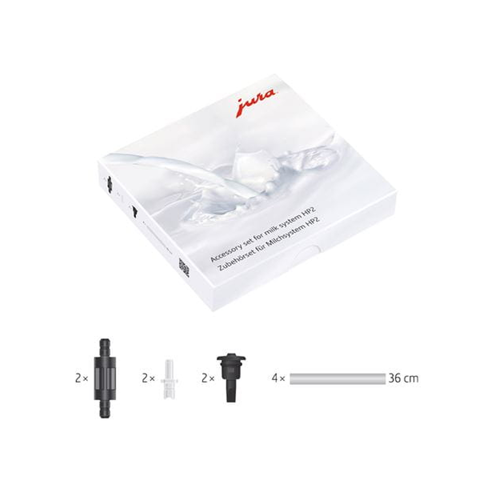 Ensure the hygiene and efficiency of your Jura coffee machine’s milk system with the Jura 24116 Accessory Set. This comprehensive set, which includes milk pipes, connectors, and intake pipes, should be replaced every three months with regular use. The milk pipes can be cut to the required length, making it versatile for different setups. Designed for compatibility with HP1, HP2, or HP3 milk systems, it is essential for maintaining the quality of your milk-based coffee beverages.
