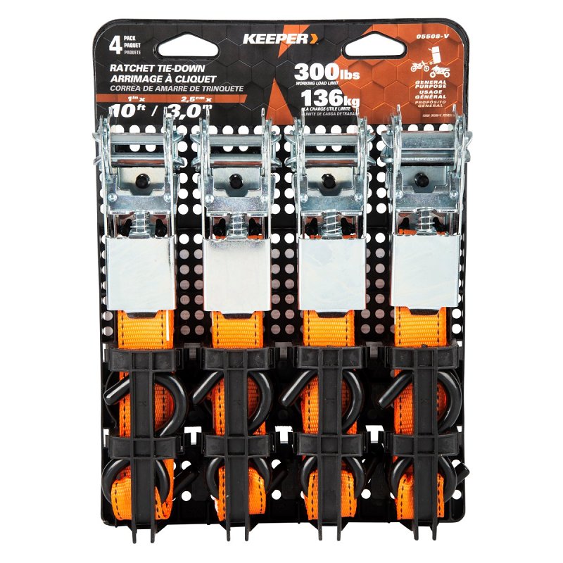 Keeper® 10 ft x 1 in ratchet tie-downs are engineered to provide a safe, efficient alternative to rope and other methods of securing cargo for transport. Tie-downs has a 300 lb working load limit and 900 lb break strength, the perfect everyday solution for securing smaller loads. Hi-Test® webbing is rot and abrasion resistance and the ratchet tie-down maximize tension making it ideal for demanding conditions. The spring-loaded release protects against accidental opening and the vinyl-coated S-hooks is rust resistant for increased product life. Keeper® Ratchet Tie-Down is the optimal solution to securing mid-sized cargo loads. Available in a 4 pack.