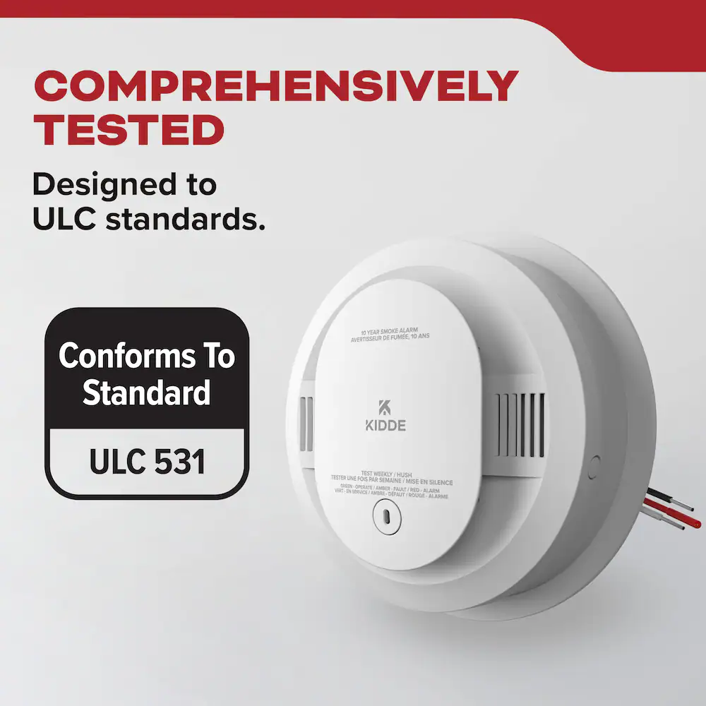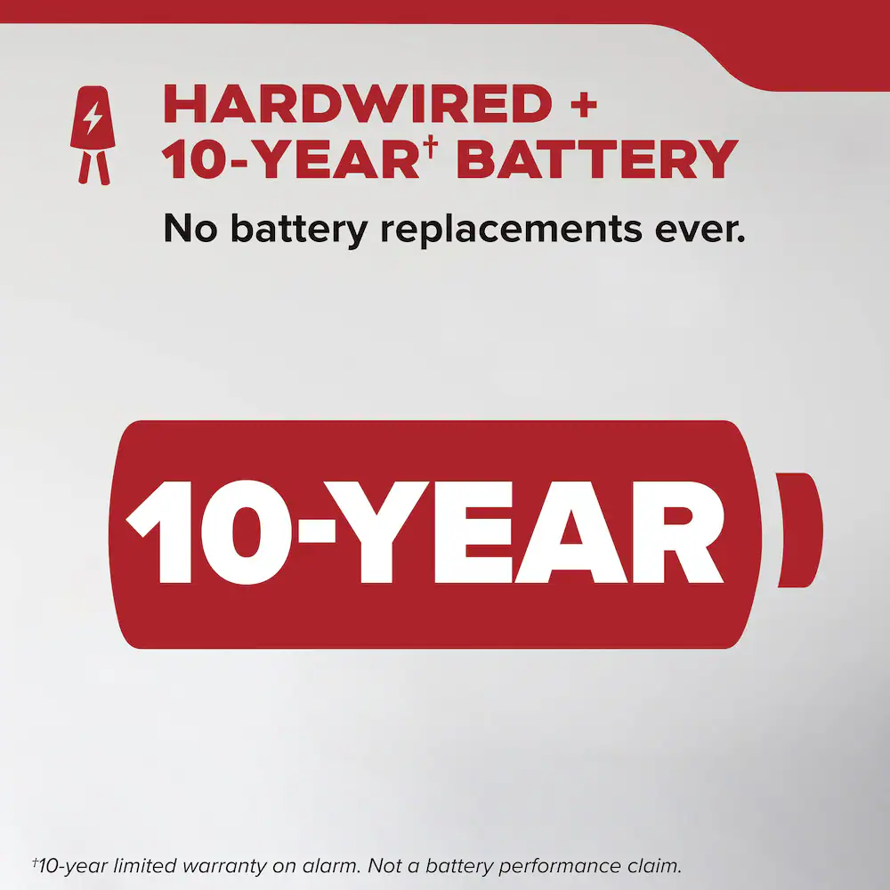 Modern design with cutting-edge technology delivers fast alerts and enhanced sensing to reduce cooking-related false alarms. UL/ULC tested and certified for safety and reliability. Features 120V AC power with a 10-year sealed backup battery (never needs changing), self-testing capability, and easy twist-and-click installation. Includes end-of-life notification that alerts you after 10 years when replacement is needed. Interconnected alarm activation ensures all alarms sound during an emergency, giving your family more time to evacuate safely.