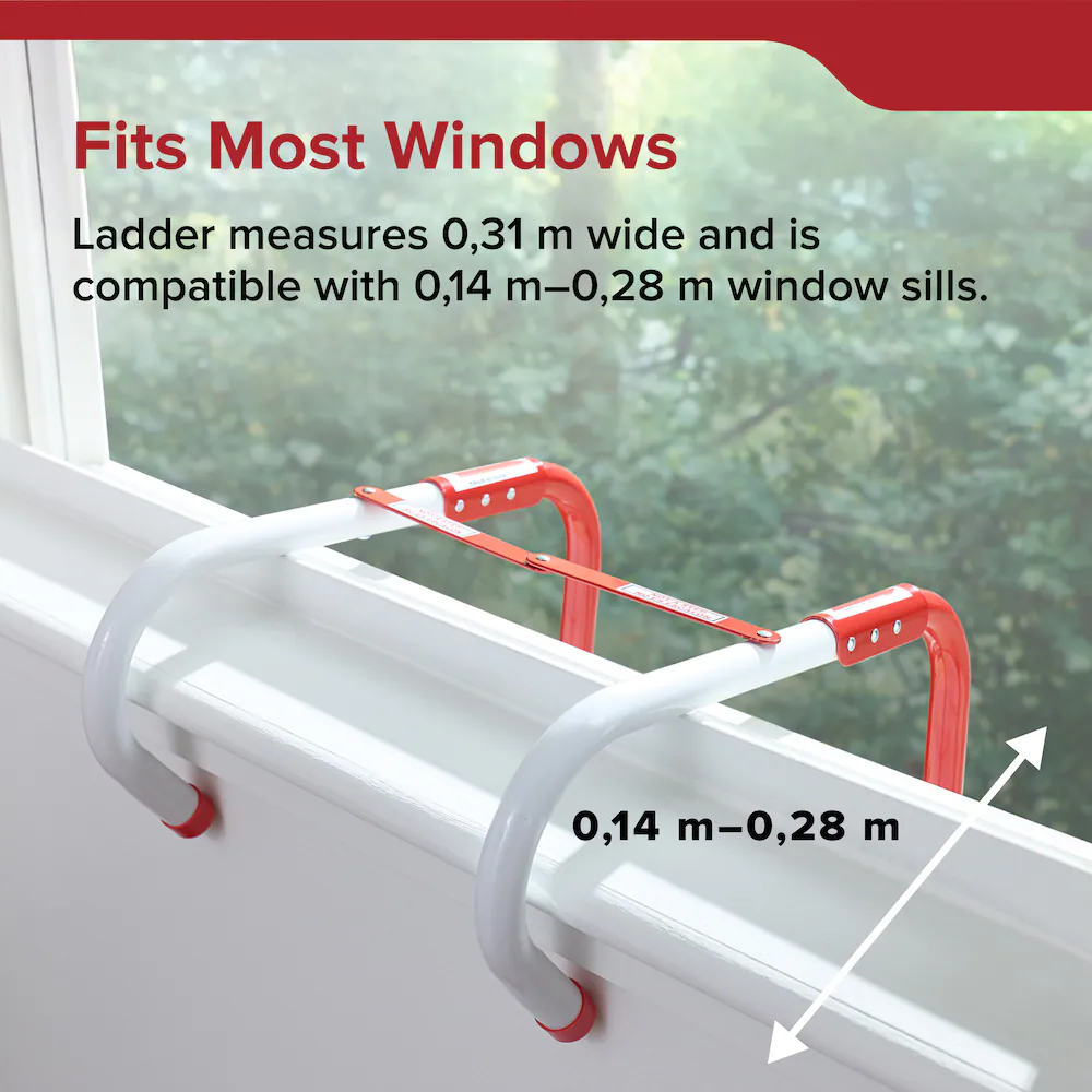 Recommended for use in the home, the 3-Story Kidde Escape Ladder comes fully assembled, to attach quickly to most common windows without the use of tools. Load tested to 1000 lbs and features antislip rungs Maximum window frame capacity: 11 inches Minimum width: 16 inches