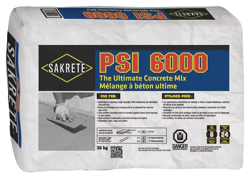 Construct sidewalks, slabs, steps or patios. Use SAKRETE PSI 6000, a high-strength, crack-resistant, air-entrained concrete mix. Available in 30 kg bags. Go with SAKRETE, the Pro’s choice since 1936.