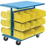All-welded bin cart, Work surface made of 14-gauge steel, Includes bolted on 5″ non-marking casters and 2 louvered bin panels, 1000-lb. capacity, Durable Kleton blue finish; ;, Bins supplied: 16x 8 1/4″ W x 14 3/4″ D x 7″ H; 4x 16 1/2″ W x 14 3/4″ D x 7″ H