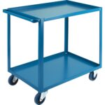 All-welded ready to use, Versatile for all material transport, Cart constructed from 14-gauge steel shelves welded to 1 1/2″ x 1 1/2″ x 1/8″ steel angle posts, 1″ diameter tubular steel handle, Shelves is available with a 1 1/2″ lip configured up or down, 2 rigid and 2 swivel bolted-on 5″ non-marking casters, Capacity: 1200 lbs. evenly distributed, Durable Kleton blue enamel finish