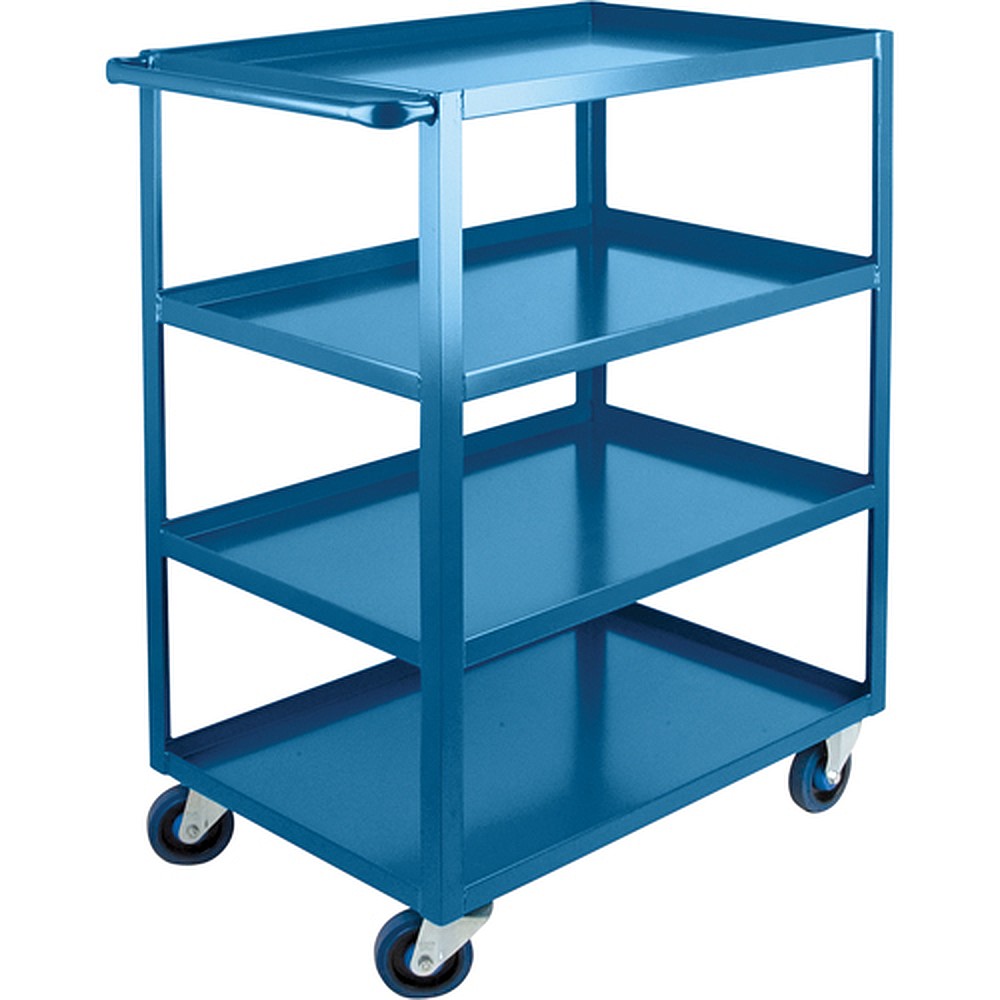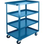 All-welded ready to use, Versatile for all material transport, Cart constructed from 14-gauge steel shelves welded to 1 1/2″ x 1 1/2″ x 1/8″ steel angle posts, 1″ diameter tubular steel handle, Shelves is available with a 1 1/2″ lip configured up or down, 2 rigid and 2 swivel bolted-on 5″ non-marking casters, Durable Kleton blue enamel finish