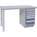 Features one adjustable steel leg and one pedestal, Pre-designed workbenches are a simple, easy-to-assemble solution, Available in many configurations and table tops, Built to withstand industrial use