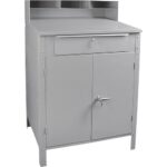 Durable carbon steel construction, Same features as the open floor style shop desk, with an added double door locking cabinet, Four-compartment organizer and slightly sloped 43″ H writing surface, Optional caster kit to convert to mobile unit, 23″ W x 16″ D x 3 1/2″ H locking drawer on quiet nylon rollers, Grey enamel finish, Ships knocked down