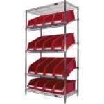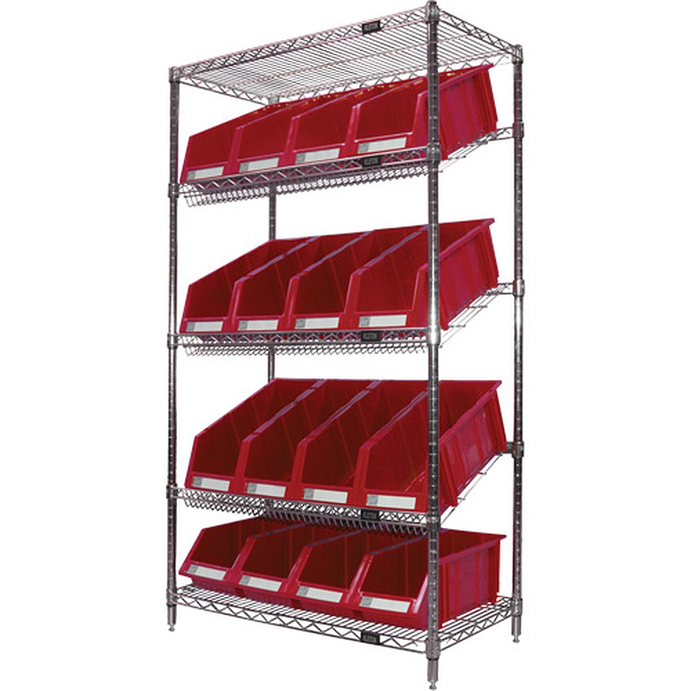 Slanted shelving allows for better visibility of stored items, Includes: (3) Slanted shelves, (2) Flat shelves, (16) Red shelf bins