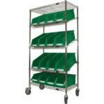 Slanted shelving allows for better visibility of stored items, Features 3 slanted shelves, 2 flat shelves and 16 green shelf bins, NSF certified