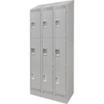 Ships knocked down, ready to assemble with nuts and bolts included, 16-gauge frames, 24-gauge body and shelves, Double pan construction doors, 20-gauge outer and 24-gauge inner pans, Stainless steel recessed padlock handles, Magnetic latch ensures door is properly fastened when closed, Three zinc-plated coat hooks and one shelf included with single and double tier lockers, Durable powder-coated grey paint finish, Number plates available separately