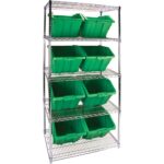 Adjustable chromate wire shelves, Wire shelving resists corrosion and provides greater visibility to stored parts, Wire shelves prevent build up of dust and dirt, Bins are unaffected by oil, alkaline and most acids, Ideal in production or for parts storage, Assembly required, Stationary unit’s total capacity should not exceed 2000-lb., NSF certified