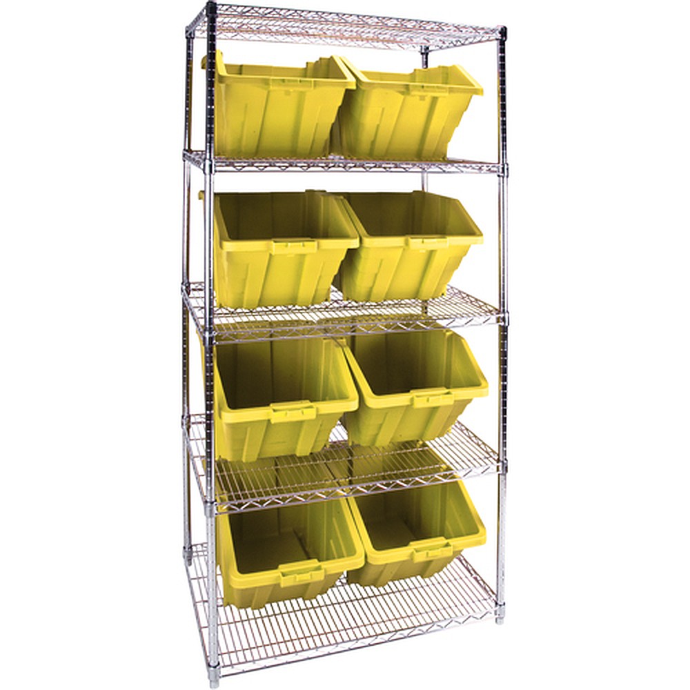 Adjustable chromate wire shelves, Wire shelving resists corrosion and provides greater visibility to stored parts, Wire shelves prevent build up of dust and dirt, Bins are unaffected by oil, alkaline and most acids, Ideal in production or for parts storage, Assembly required, Stationary unit’s total capacity should not exceed 2000-lb., NSF certified