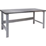 Top constructed of 14-gauge stainless steel with a number 4 finish and formed edges, Top reinforced with wood core for sound reduction and added strength, 1 3/4″ overall thickness, Legs and stringers are constructed from 14-gauge steel powder coated Kleton grey finish