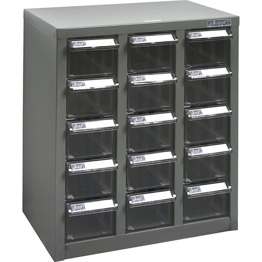 New design allows 98% use of drawer space to store larger tools or materials, Housed in all-welded galvanised steel cabinet, I.D. card with clear plastic shield and divider included with every drawer, Plastic tabs and drawer stoppers allow for full extension without risk of spilling, Grey enamel finish, Clear polystyrene drawers