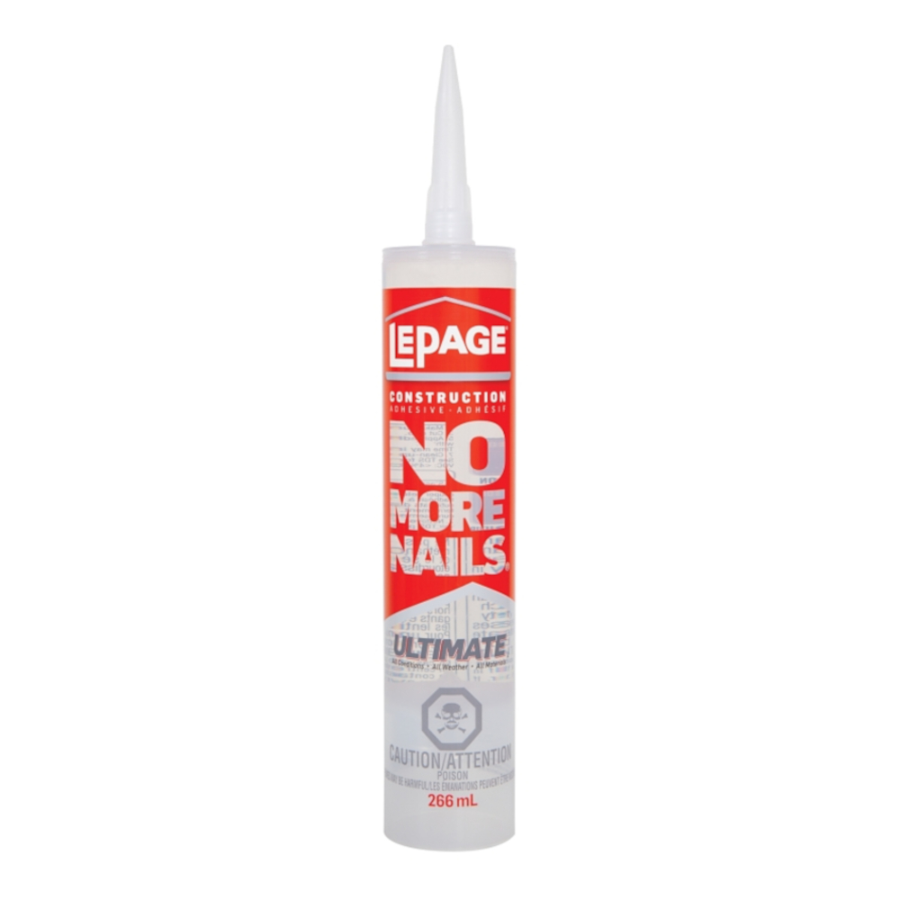 LePage no more nails heavy-duty construction adhesive is a premium quality, heavy-duty, gap-filling adhesive for both indoor and outdoor projects. It has an extremely high tack, which eliminates the need for nails and screws in many DIY and repair jobs. No more nails heavy-duty is weather-resistant and paintable. The adhesive has a very low odor and requires only soap and water to clean up. This makes it safe, easy to use and environmentally friendly.