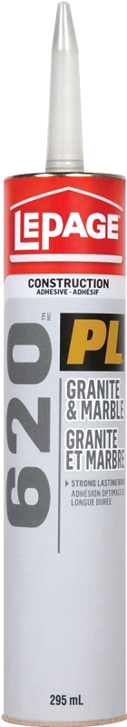 LePageĀ® PL 620 granite and marble construction adhesive is a premium quality adhesive formulated specifically for bonding marble, granite and a wide variety of other building materials. Its innovative formulation can be used in high moisture areas and will not bleed through or stain marble and granite. PL 620 is a revolutionary construction adhesive that provides superior results, has an extremely mild odor and a low VOC content, therefore making it ideal for both interior and exterior applications.
