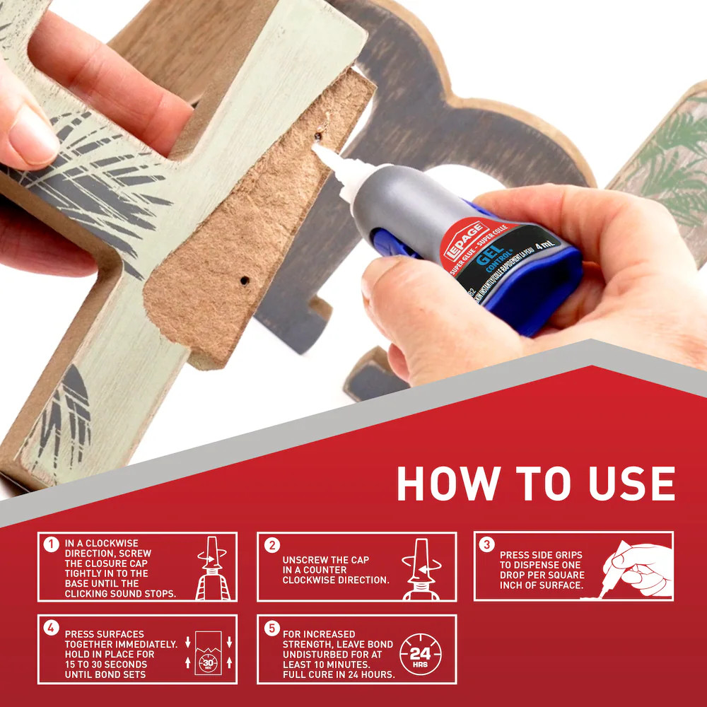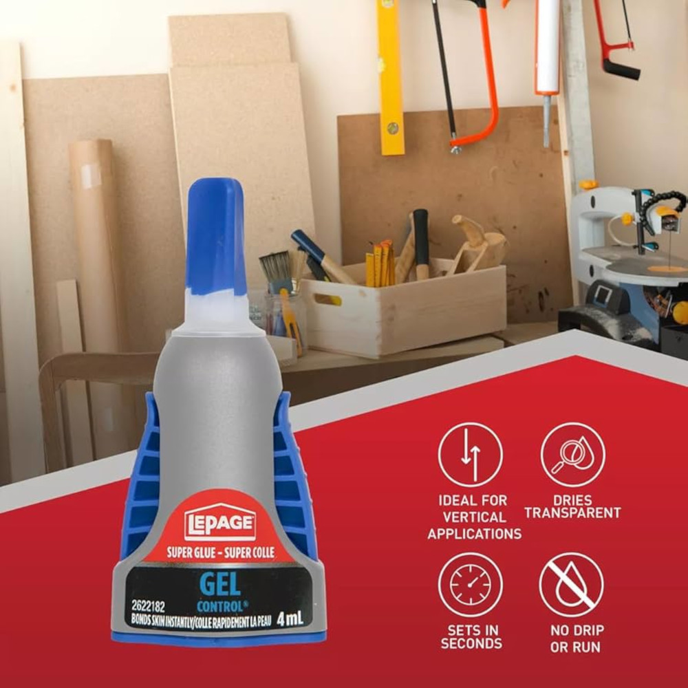 LePage® super glue gel control has proven superior performance over ordinary super glues. It works faster and holds stronger on more surfaces than ordinary instant adhesives thanks to a patented additive. The gel formula works on a variety of porous and non-porous surfaces and is ideal for vertical applications. Super glue gel control comes in patented side-squeeze design for maximum control. It dries clear and sets without clamping. Super glue gel control is resistant to moisture, most chemicals and freezing temperatures.