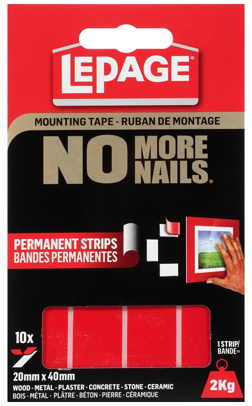 LePage® No More Nails Permanent strips mounting tape is a heavy-duty, double-sided mounting tape in strips for convenient, fast and easy mounting indoor and outdoor. One strip holds up to 2 kg.