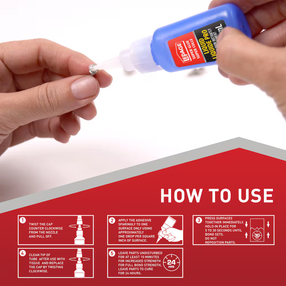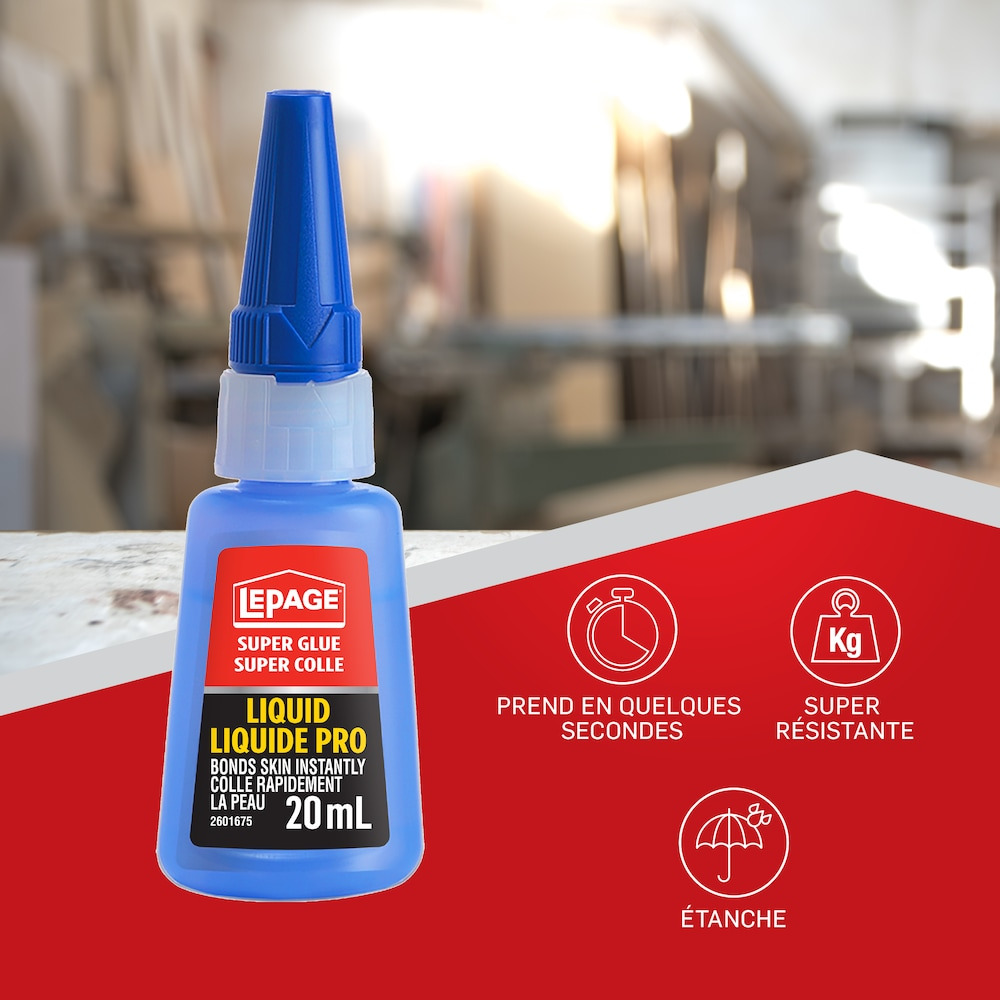 LePage super liquid pro has proven superior performance over ordinary super glues. It works faster and holds stronger on more surfaces than ordinary instant adhesives thanks to a patented additive. The liquid formula works well on a variety of porous and non-porous surfaces and close fitting repairs. Super glue liquid pro’s super strength formula is ideal for heavy-duty projects and repairs. It dries clear and sets without clamping and is also resistant to moisture, most chemicals and freezing temperatures.