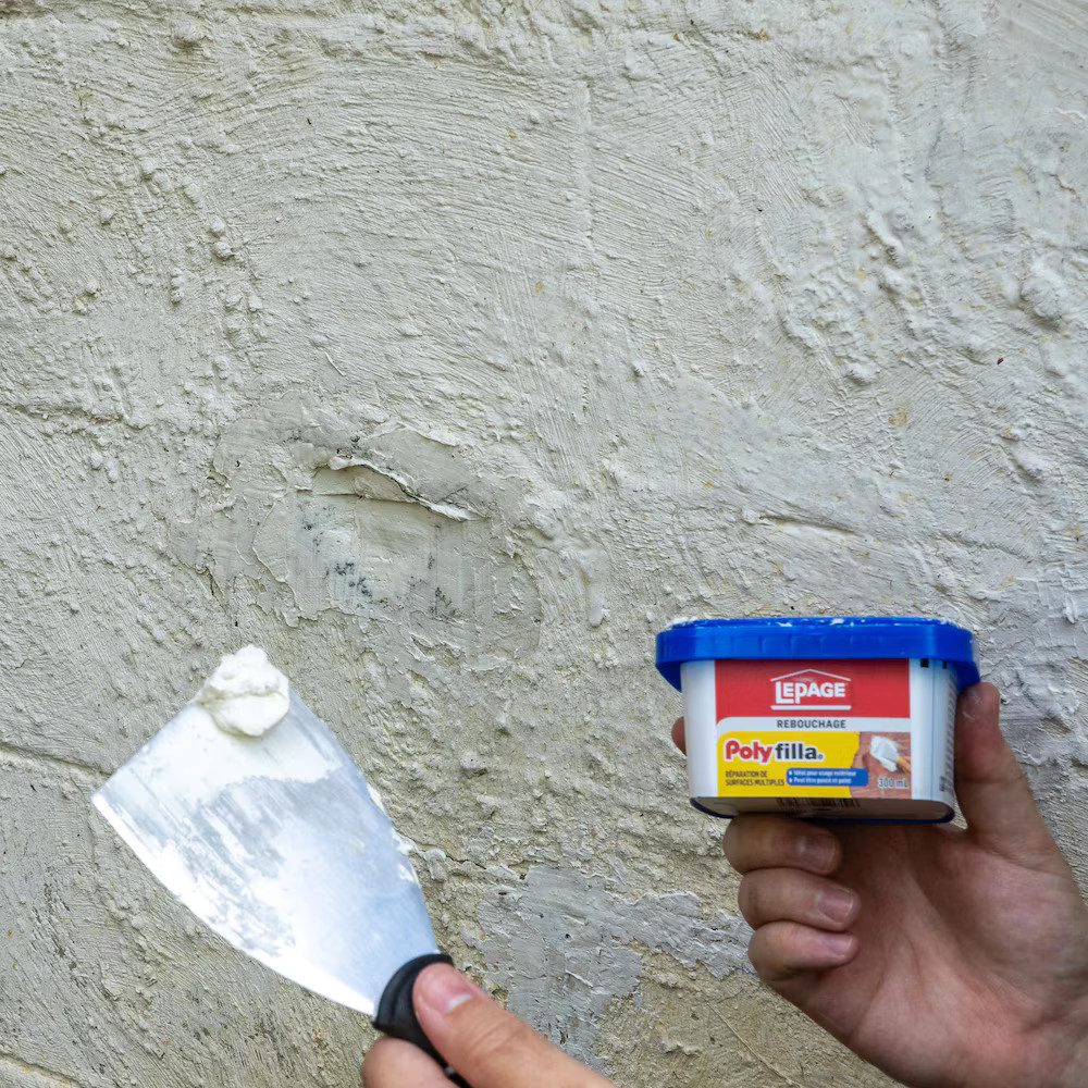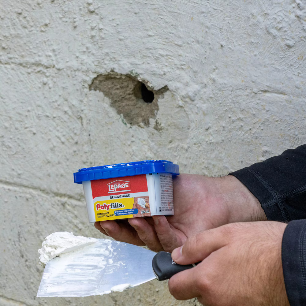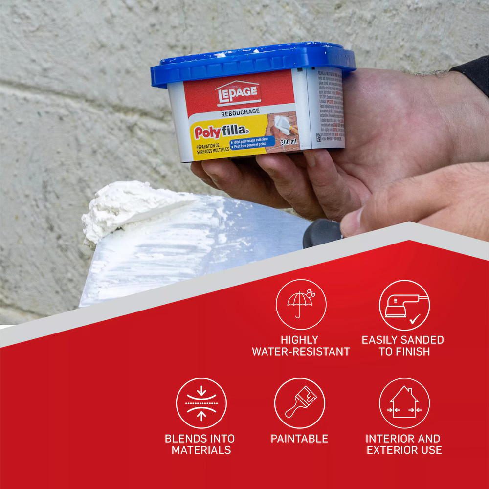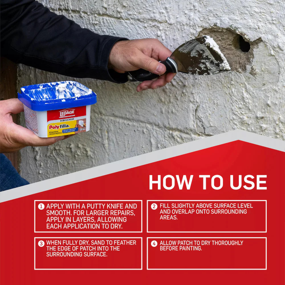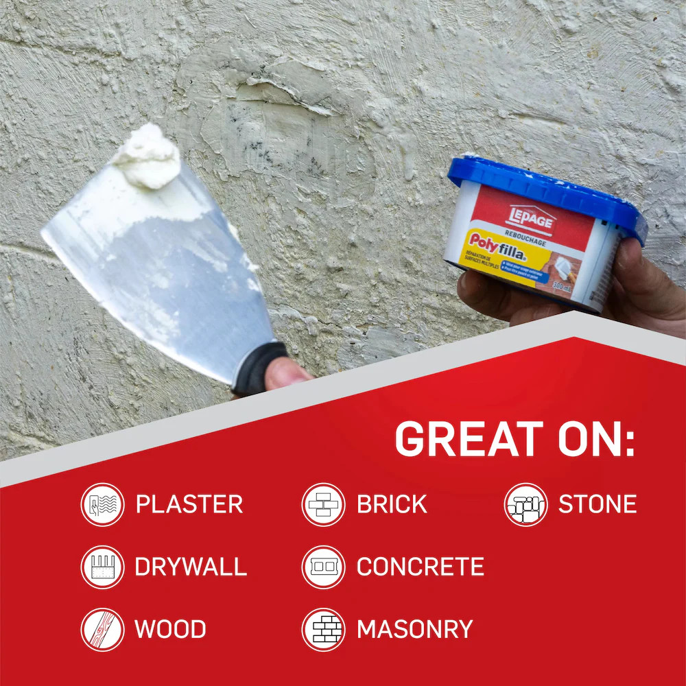 LePage® Polyfilla® multi-surface repair is a ready-to-use, multi-purpose, water-resistant patching compound. Excellent for repairs inside and outside the home, on all the surfaces you may encounter such as plaster, drywall, wood, brick, concrete and masonry. Use to repair small cracks, holes and imperfections like nail holes, hammer dints, rough wood grain, cracked paint and chipped concrete block. Spreads smoothly on ceilings and walls. It resists cracking and is sandable and paintable.