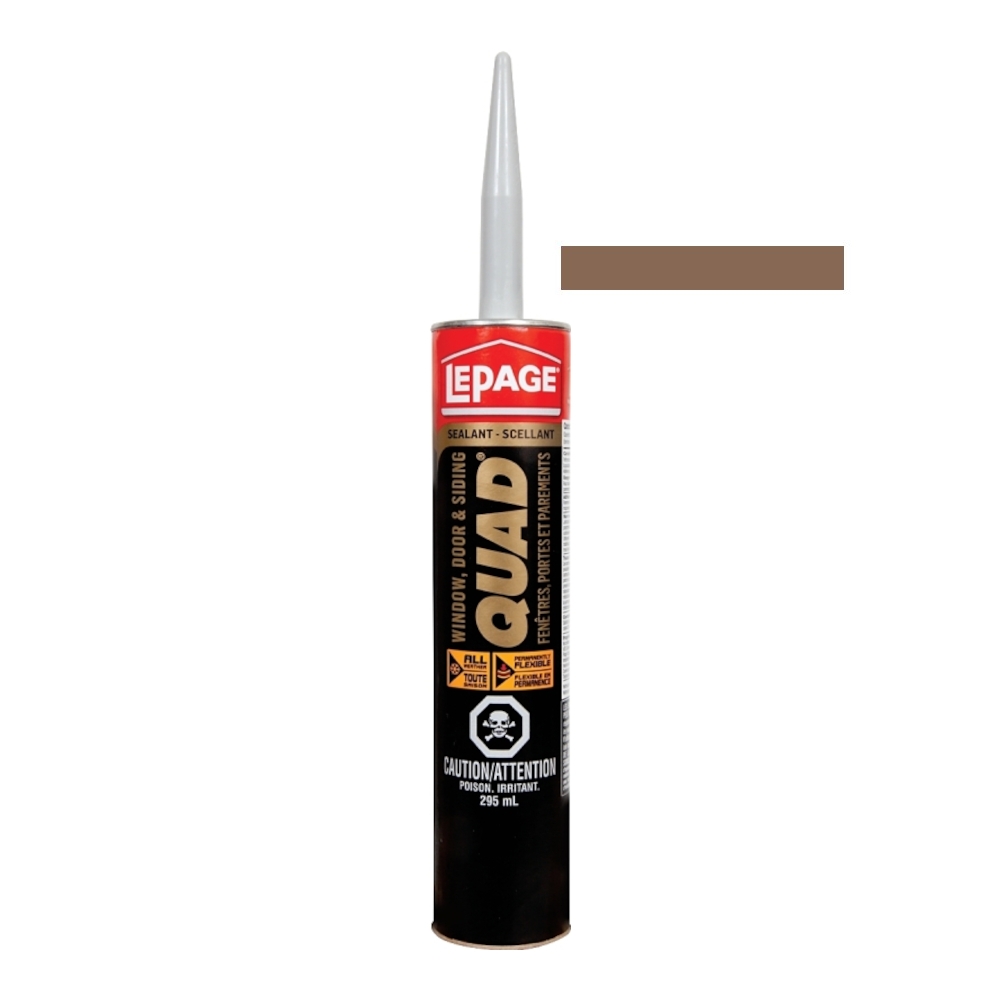 LePageĀ® QUAD VOC, a low VOC sealant for window, door and siding installation, is composed of elastomeric polymers and high-quality synthetic resins. This product offers the superior adhesion characteristics and unmatched elasticity found in high-performance sealants. It yields a tough, rubbery seal which resists outdoor weather-related elements like water, oxygen, ozone, heat and UV light. The formula skins over in a short time to resist dirt and dust pickup. It goes on smoothly and has easy cut-off without stringing. When cured, the surface displays a slight sheen similar to some silicone sealants. QUAD VOC window, door and siding is paintable with either latex or oil-based paints. This low VOC formulation meets stringent VOC requirements.