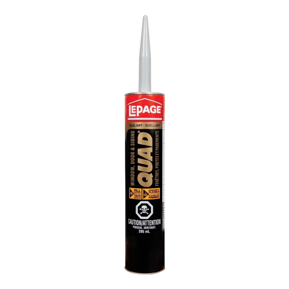 LePage Quad window, door and siding sealant is composed of elastomeric polymers and high-quality synthetic resins, this product offers the superior adhesion characteristics and unmatched elasticity found in high-performance sealants, it yields a tough, rubbery seal which resists outdoor weather-related elements like water, oxygen, ozone, heat and UV light, the formula skins over in a short time to resist dirt and dust pickup, it goes on smoothly and has easy cut-off without stringing, when cured, the surface displays a slight sheen similar to some silicone sealants, Quad window, door and siding sealants are paintable with either latex or oil-based paints.