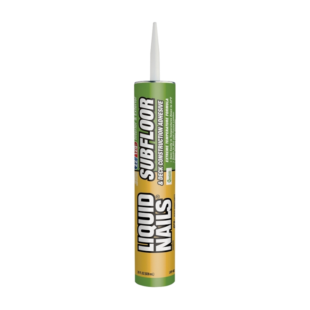 Liquid Nails® subfloor and deck construction adhesive, LN-902/LNP-902, permanently bonds wet, frozen and treated lumber, bridging gaps up to 3/8 in. This extreme temperature formula is also ideal for bonding most common building materials and is certified by UL environment to meet the GREENGUARD gold standard as a low emitting material. Also, certified by PFS corporation, an independent, third-party laboratory, to meet the requirements of the American Plywood Association AFG-01 specification for adhesives for field gluing subflooring.