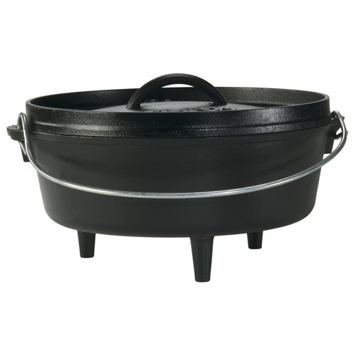 The Dutch Ovens by Lodge: Camp Dutch Oven, 4 quart, 11-1/10 dia. x 6-4/5H (exterior), flanged lid can be used to hold coals/briquettes (flip lid to use as griddle), (3) integral legs (fire safe), wire bail handle (for use with tripod), includes: Camp.