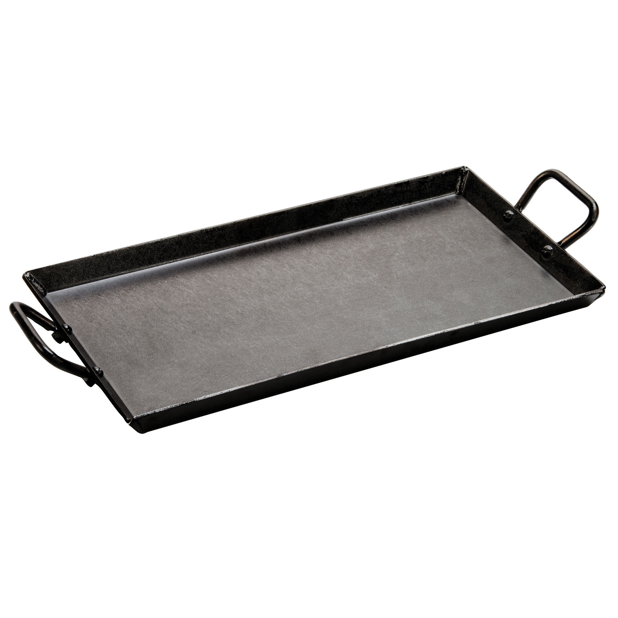 The Metal Grill Pans by Lodge: Griddle, 21-2/5 x 10-1/2 x 2-7/10H (exterior), 18 x 10 cooking surface, (2) riveted steel handles, stove top/induction/grill/campfire/oven safe, seasoned with oil, hand wash only, heavy gauge carbon steel, Made in USA (.